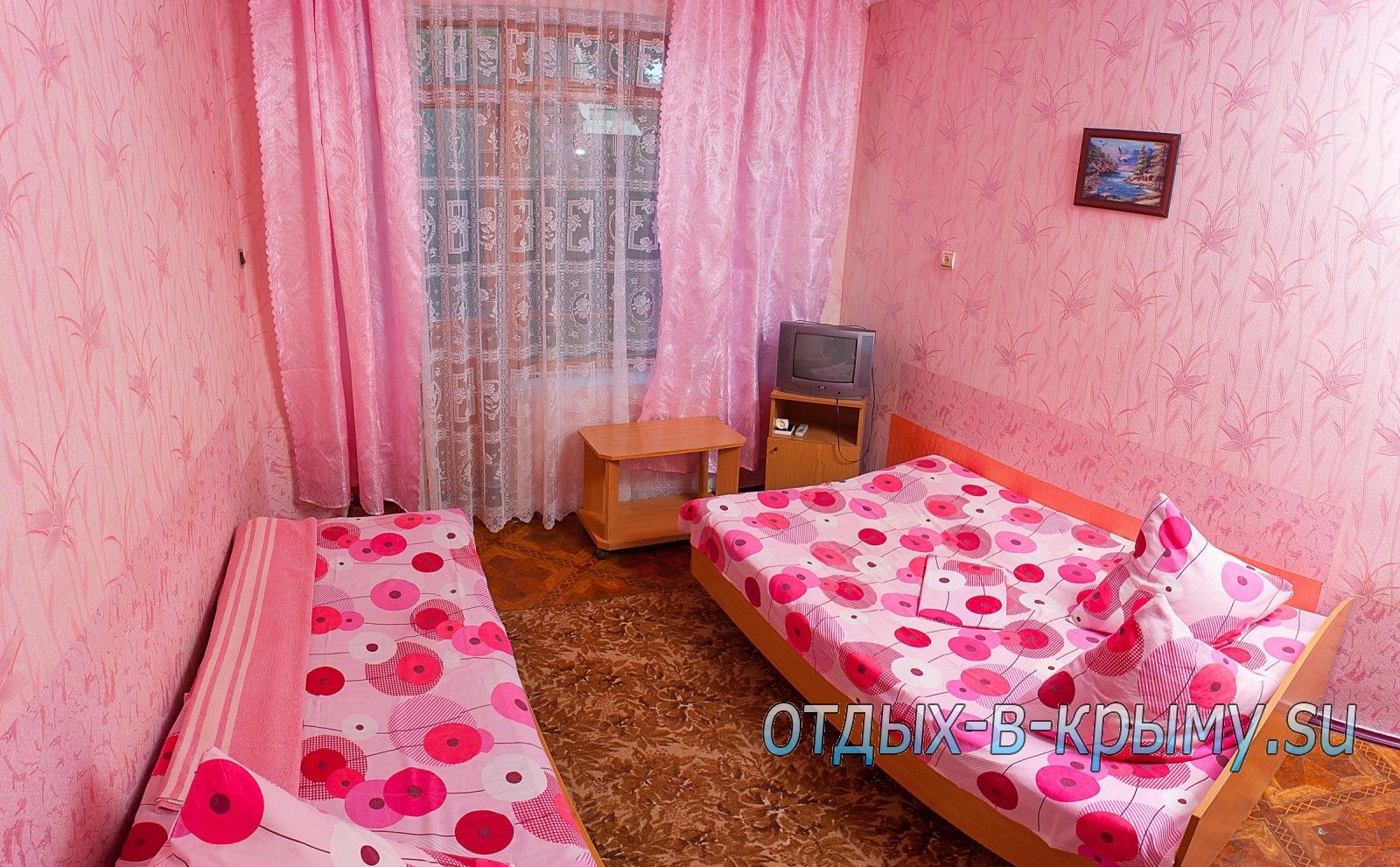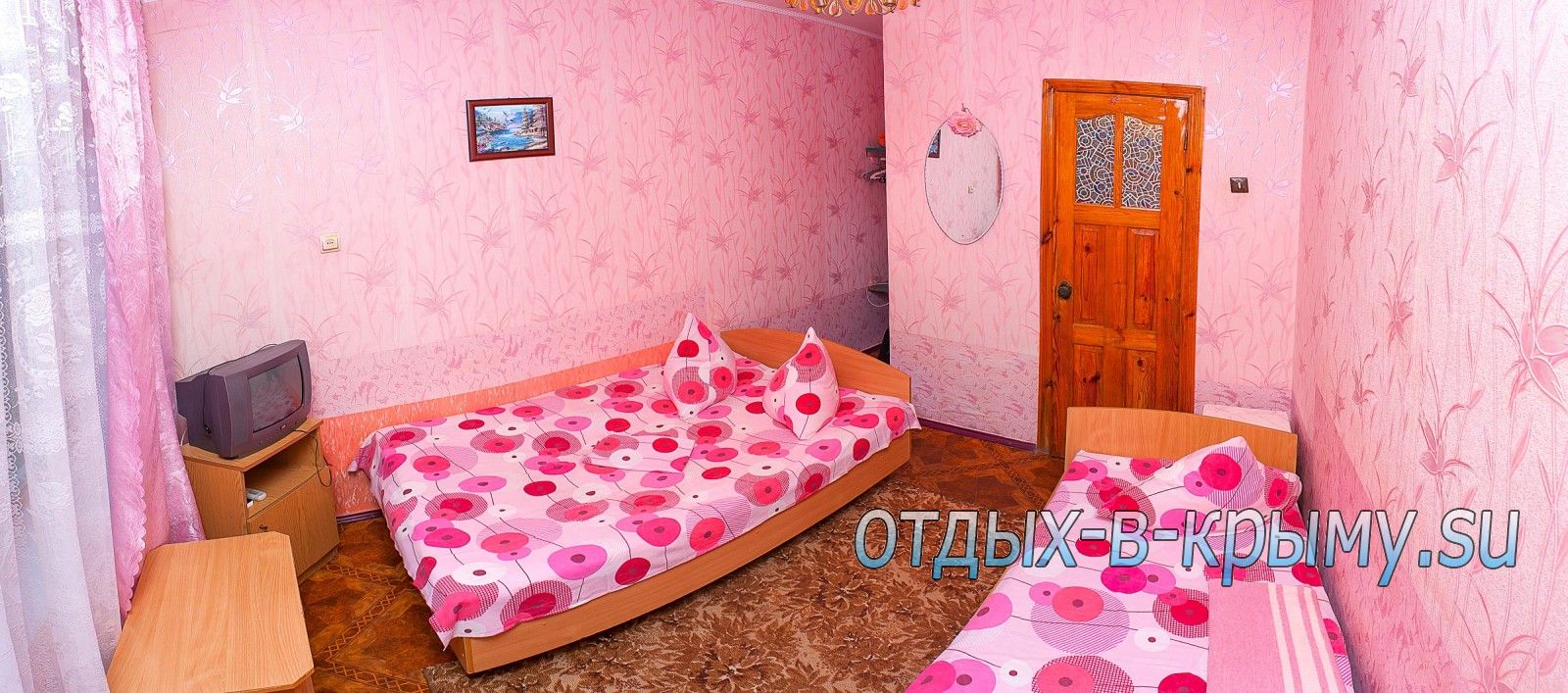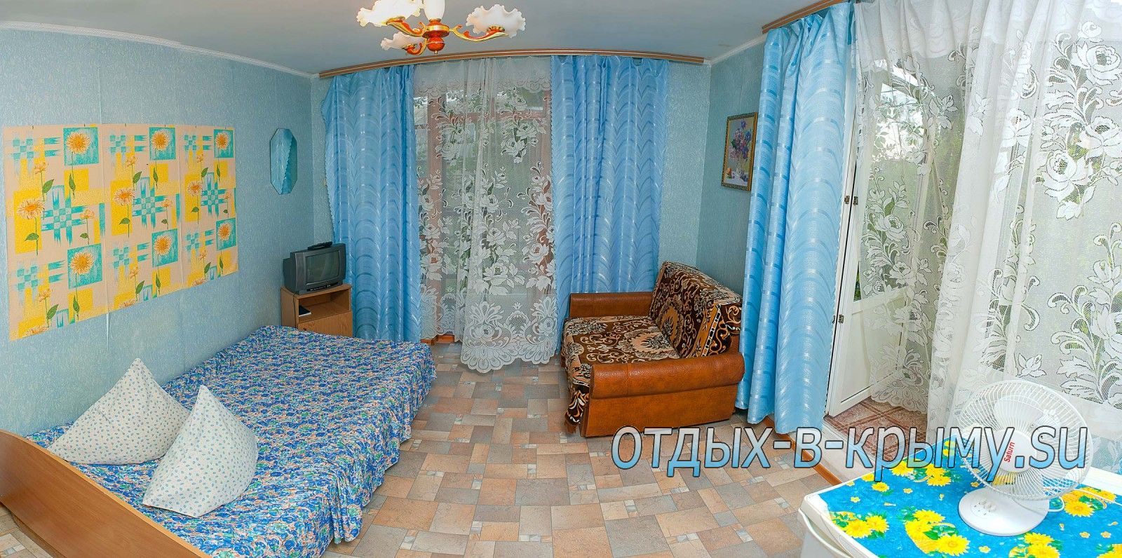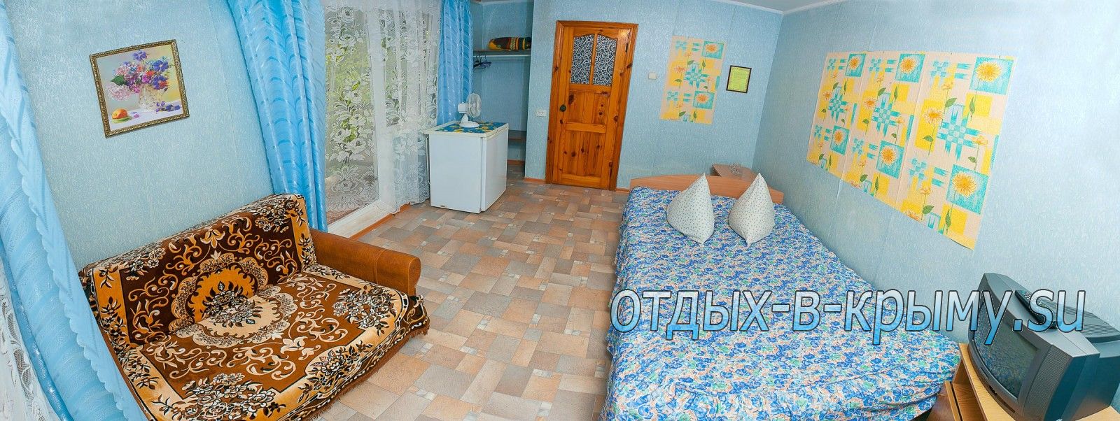 Недорогое жильё для эконом отдыха в Крыму 2022 расположено частном секторе в Судаке - комната 14 м2 на улице Бирюзовая. В номере: двуспальная кровать шириной 120см, диван, тумбочка. Номер оснащен: Вентилятор, телевизор (кабельное ТВ), Wi Fi, санузел (душ, умывальник, туалет, горячая и холодная вода круглосуточно), холодильник, кухня общая во дворе. На территории гостиницы расположены: мангал, летняя кухня. Возможное размещение 2-4 человека. Цена указана за 2 человека. Дополнительное место – 200р.