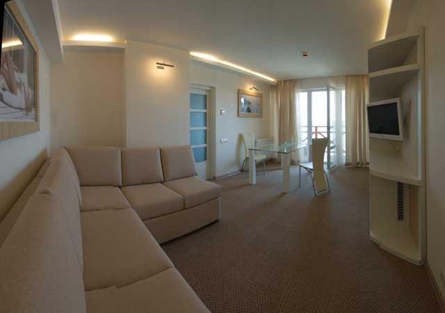 Двухкомнатный номер Люкс у моря в Новом Свете, первая линия, имеет 3 балкона с видом на море и горы, расположен на 3 этаже, рассчитан на одновременное проживание от 2-5 гостей отеля. Цена указана за 2 гостя. Стоимость дополнительного места указана в таблице цен. На детей работают скидки. Бесплатно предоставляется детская кроватка для младенцев возрастом до 2-х лет. Детям до 5 лет бесплатно предоставляются размещение в отеле (без обеспечения отдельного места) и завтрак в ресторане.