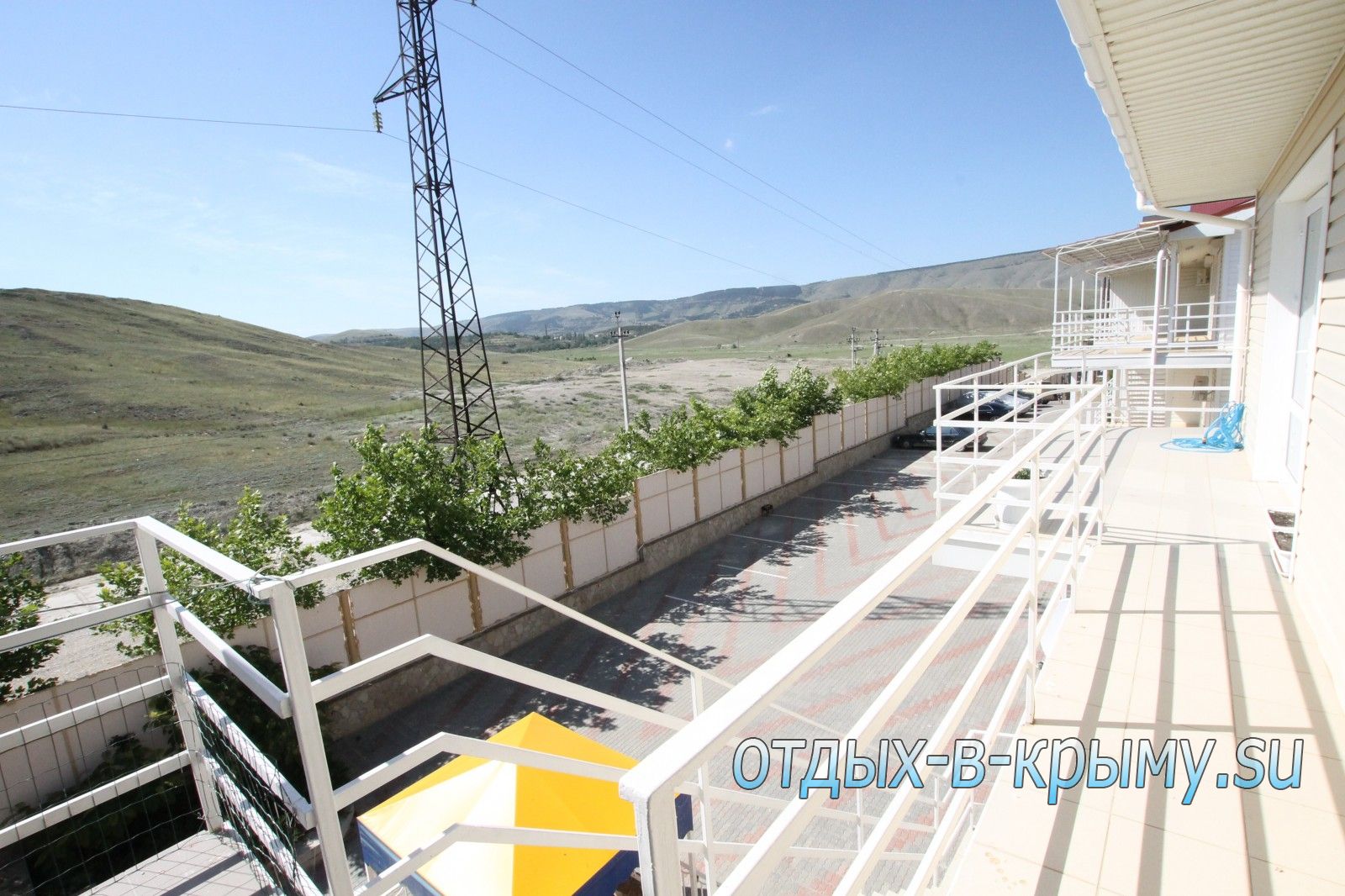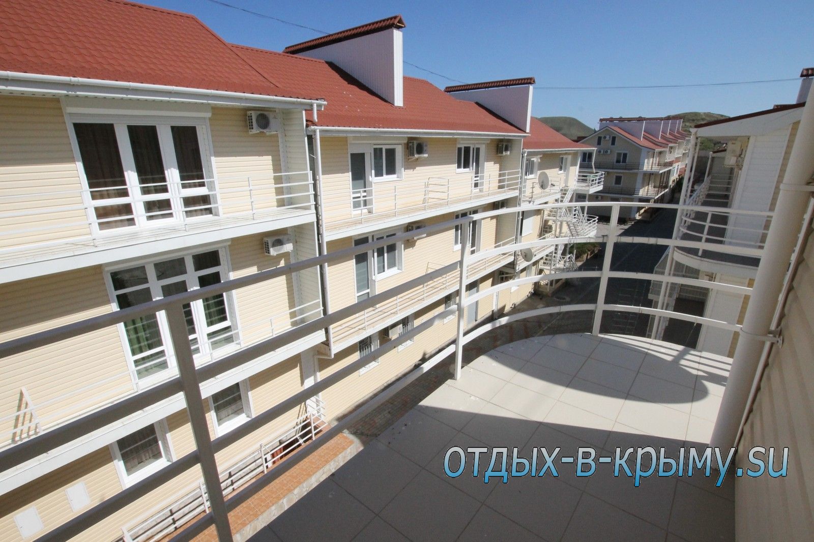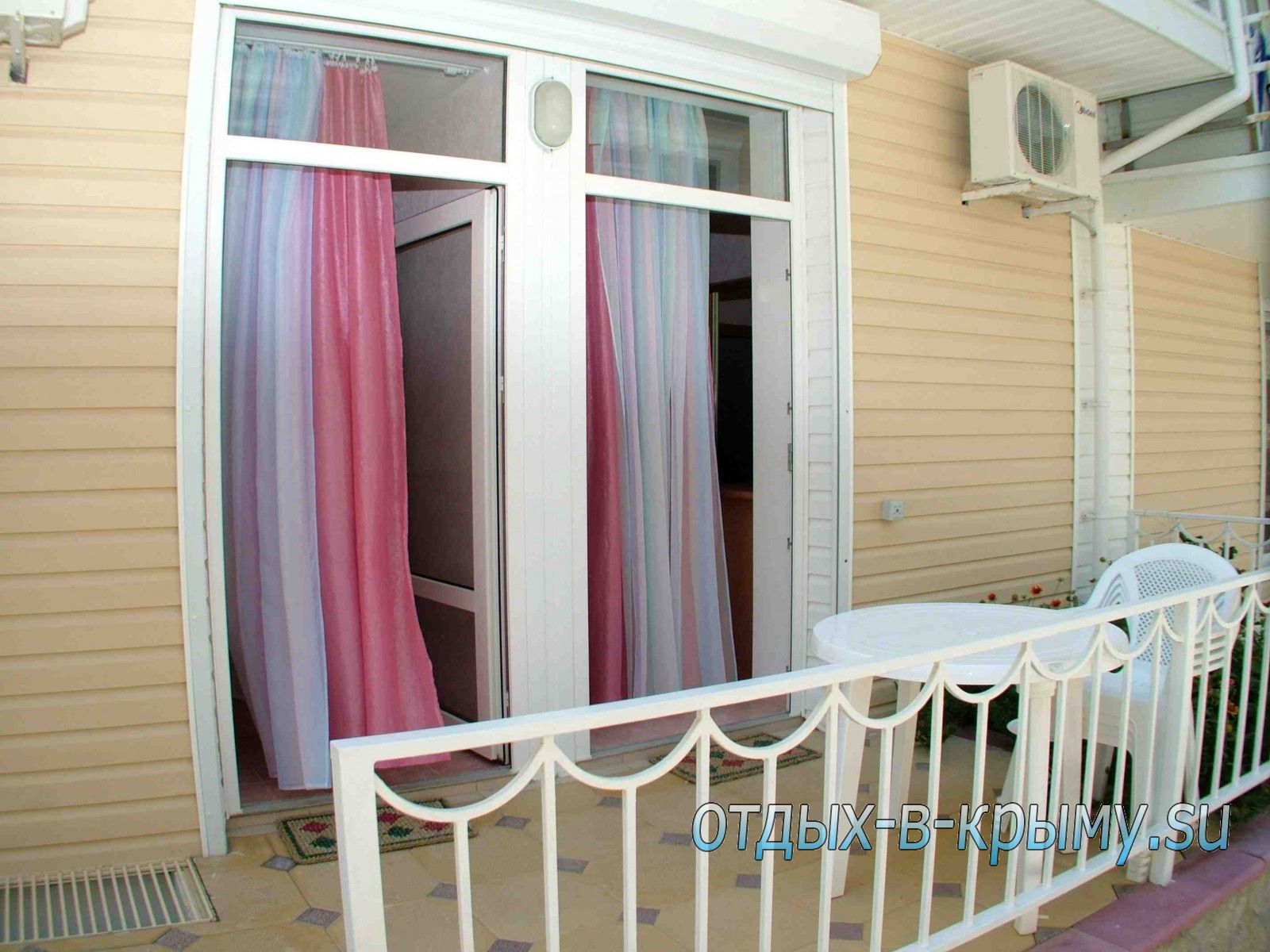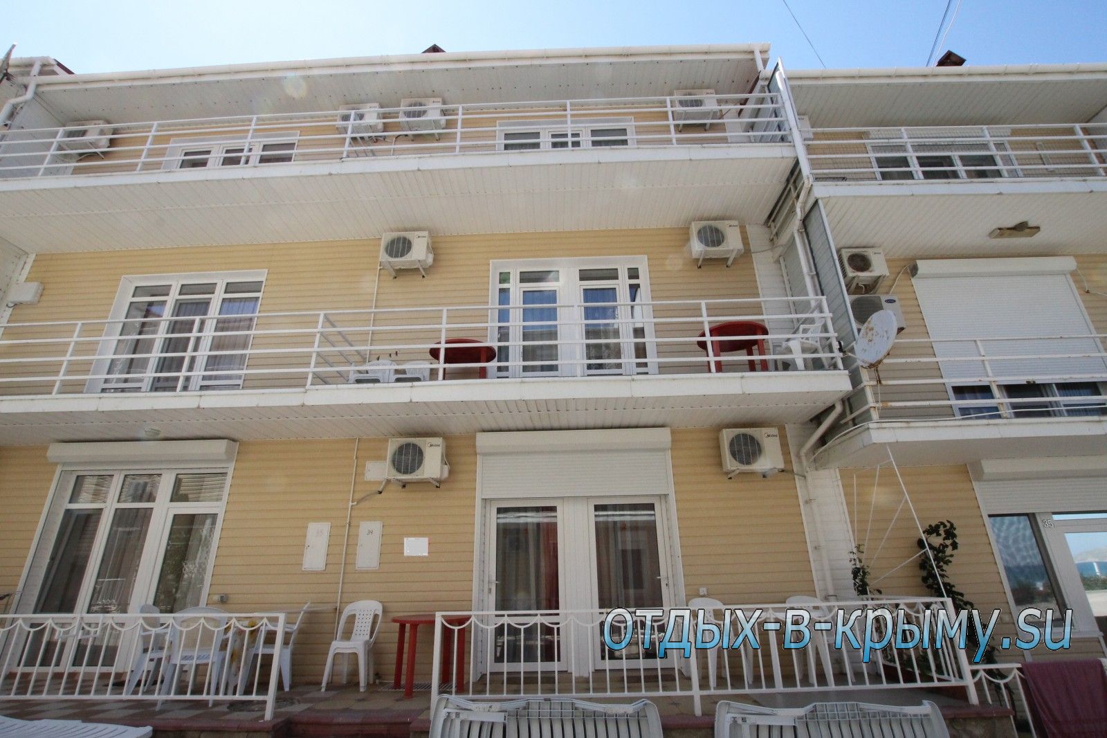 Однокомнатные номера, балкон на 2 номера , с общей кухней (в номере есть холодильник, электрочайник, микроволновка, посуда), немного видно море1,2 этажи