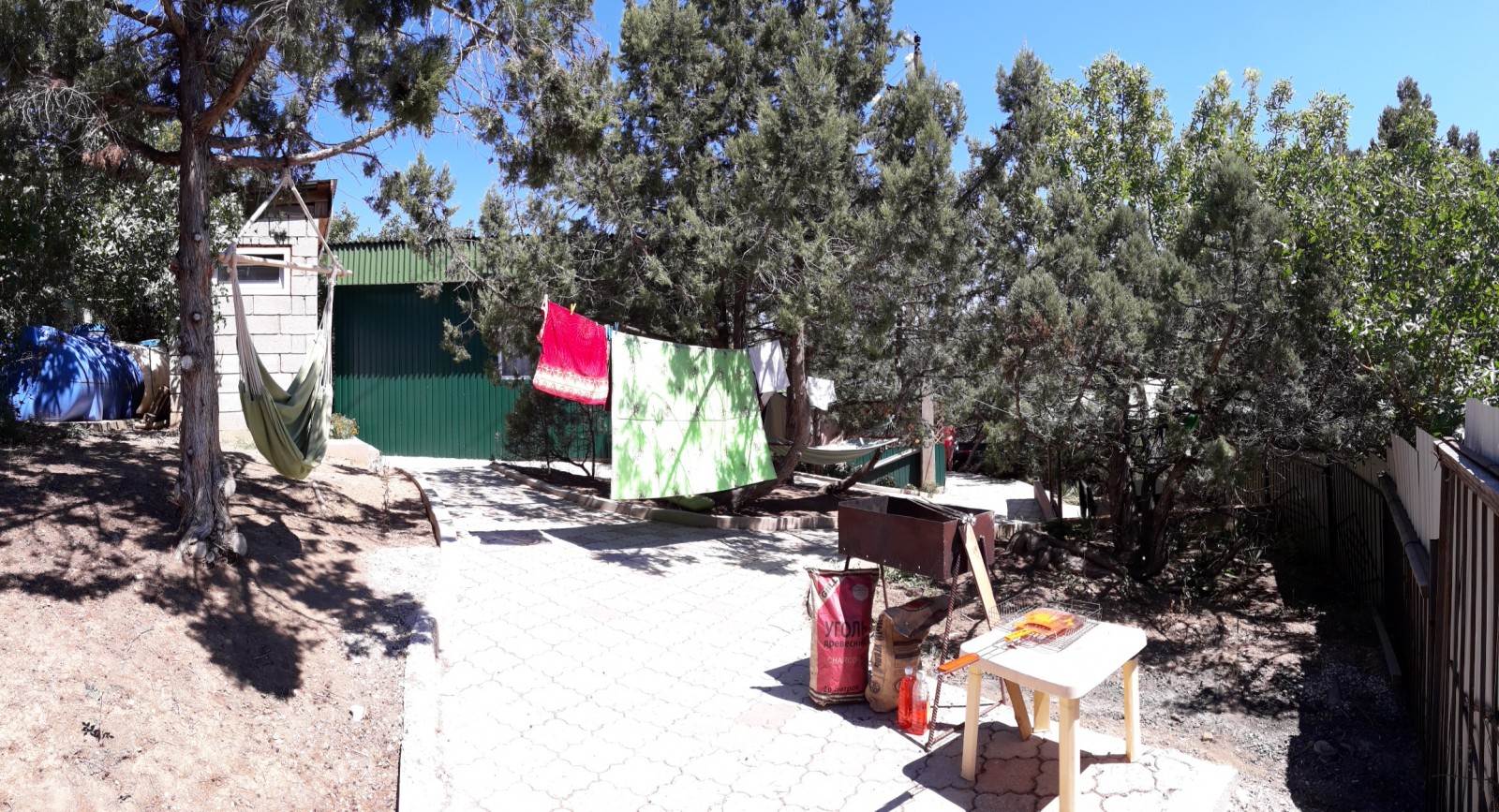 Во дворе много зелени и можжевельника, так как он расположен прямо на краю заповедника Можжевеловая роща Новый Свет.