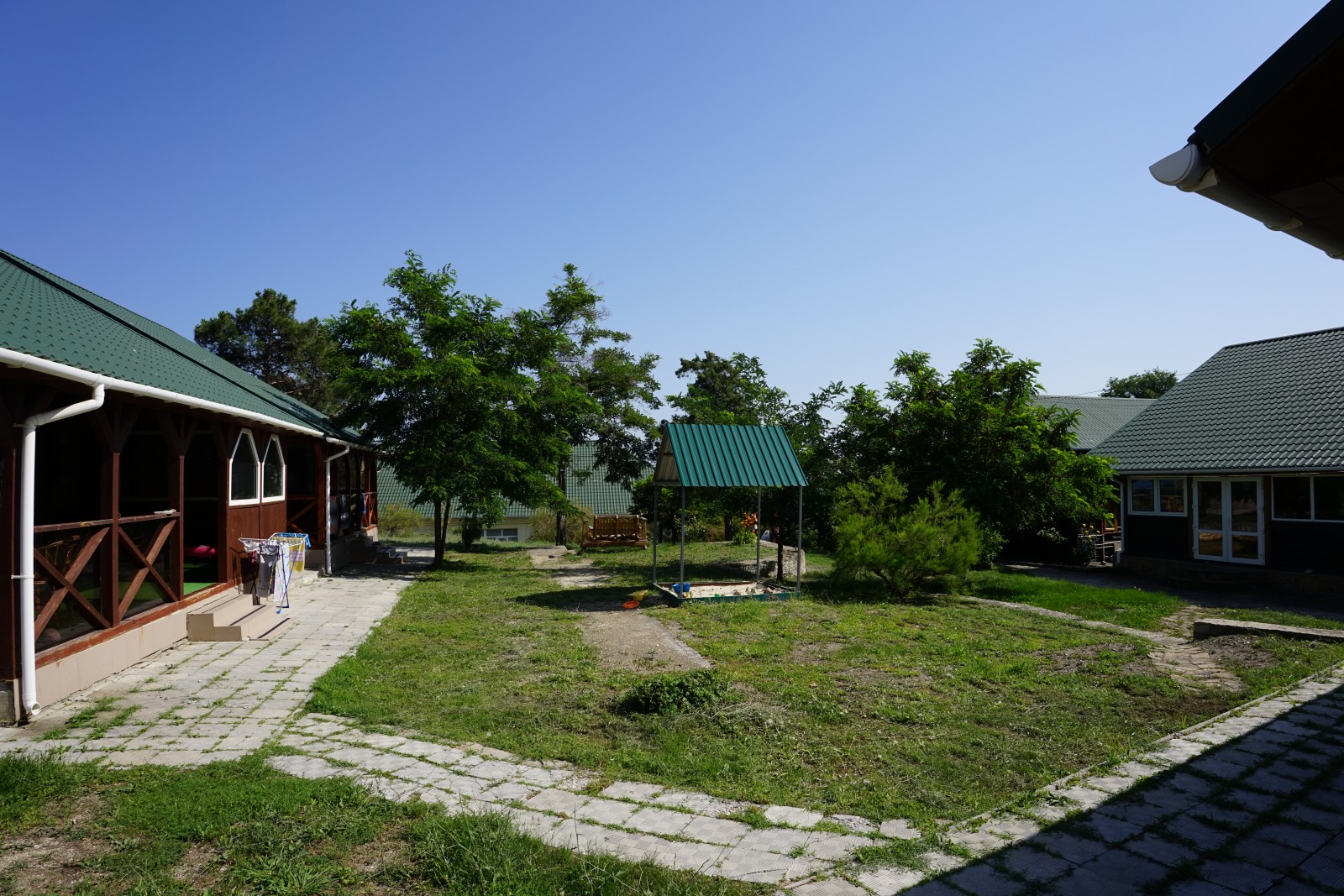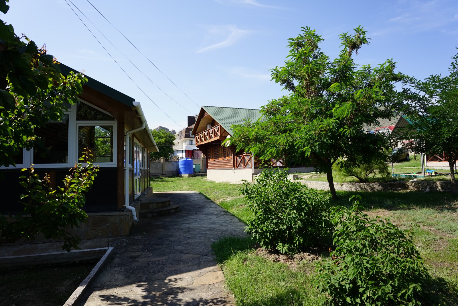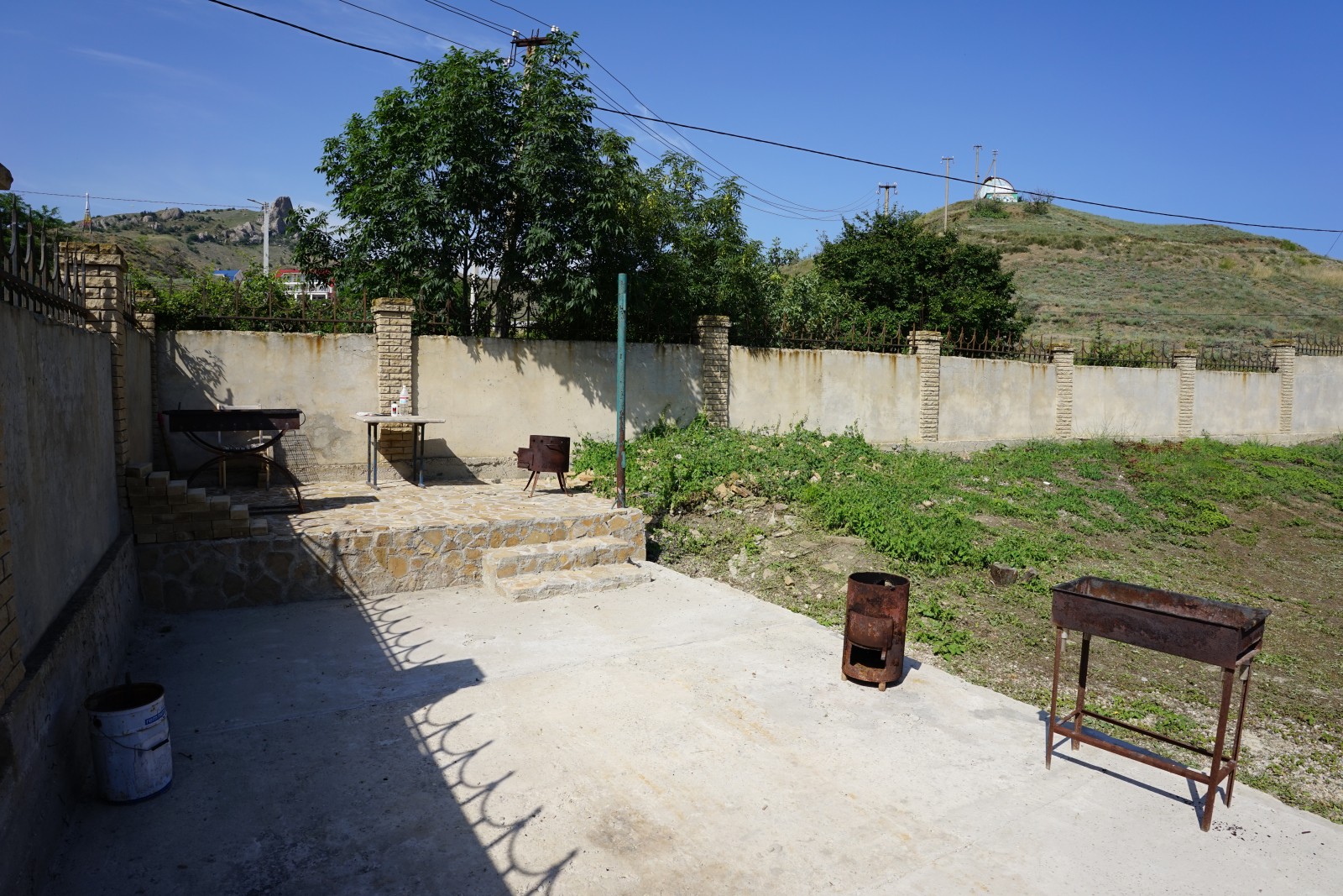Общая территория с автостоянкой зоной барбекю детской площадкой.