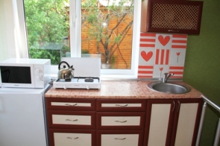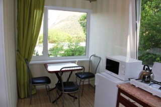 Эта квартира для отдыха в Новом Свете двухуровневая: на 1 уровне – прихожая и санузел, на 2 – комната и кухня. В комнате двуспальная кровать (160*200), диван, тумбочки, шкаф, современная отделка, металлопластиковые окна, удобная мебель. В квартире есть: кондиционер; телевизор (кабельное ТВ); санузел (умывальник, унитаз, душ, бойлер, фен); холодная и горячая вода круглосуточно; постель, полотенца, утюг (уборка и замена белья раз в 5 дней); кухня (холодильник, газ. плита, микроволновая печь, посуда). Возможное размещение 2-3 человека.